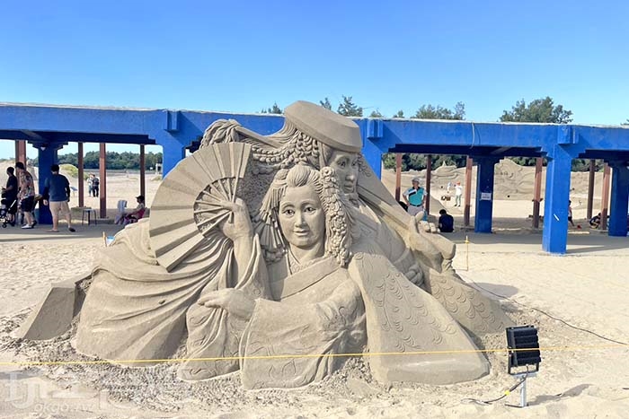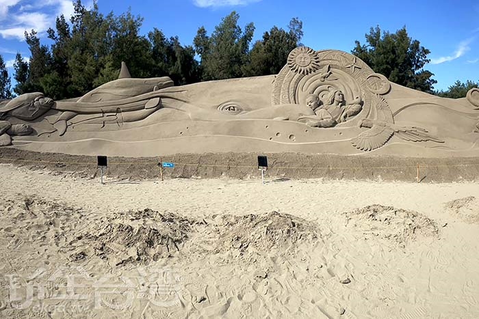 巨型主雕《永續與和平》:全長70公尺,雄偉壯觀,是全台最大規模的沙雕創作。作品刻劃著海洋生物、人類與自然的互動,細節精緻到連魚鱗的紋路、人物的表情都清晰可見。