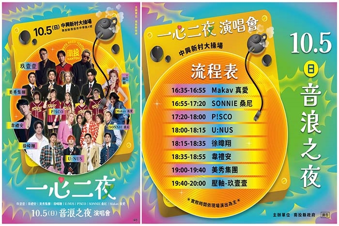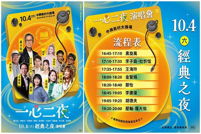 【玩全台灣旅遊網報導】【一心二夜演唱會】南投最強音浪來襲!本周末就在中興新村大操場,兩晚連續開唱,閃耀歌聲要陪你嗨翻南投夜晚!這場演唱會是 南投世界茶葉博覽會系列活動 的重頭戲,開幕日連續兩天舉辦「一心二夜演唱會」,卡司堅強,氣氛媲美跨年!