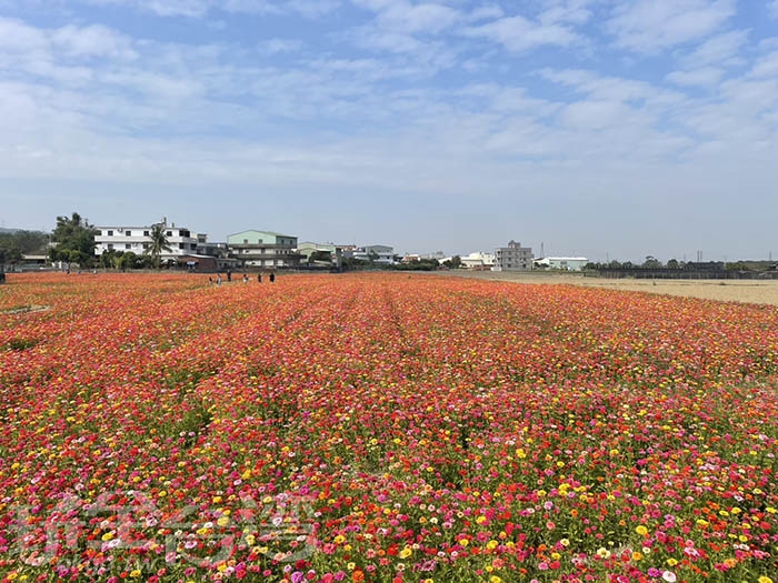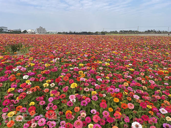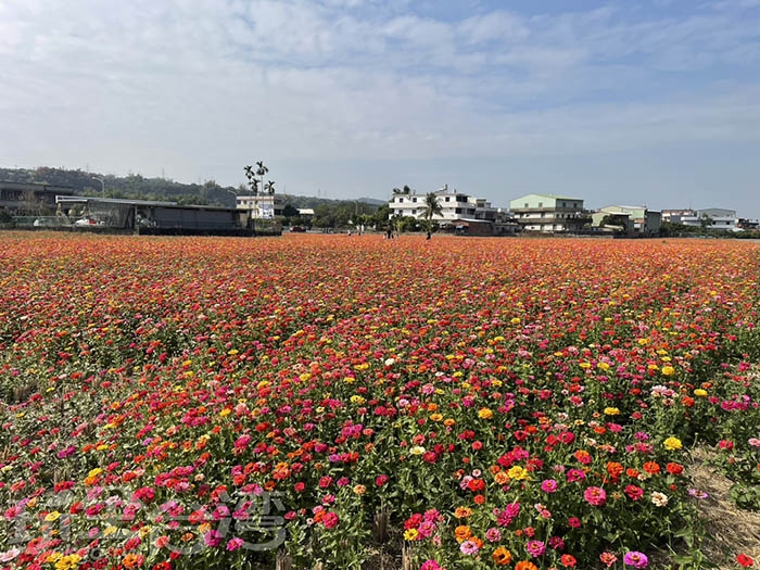 過去幾年,芬園花海多以波斯菊花海為主,今年則特別改種百日菊。百日菊花期長、色彩豐富,紅色、粉色、黃色交織在稻田間,使整片芬園花海顯得更加立體又繽紛。陽光灑落時,花朵在微風中搖曳,畫面溫暖又療癒,非常適合拍照與散步。