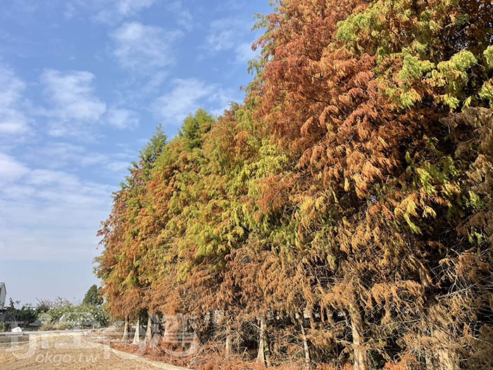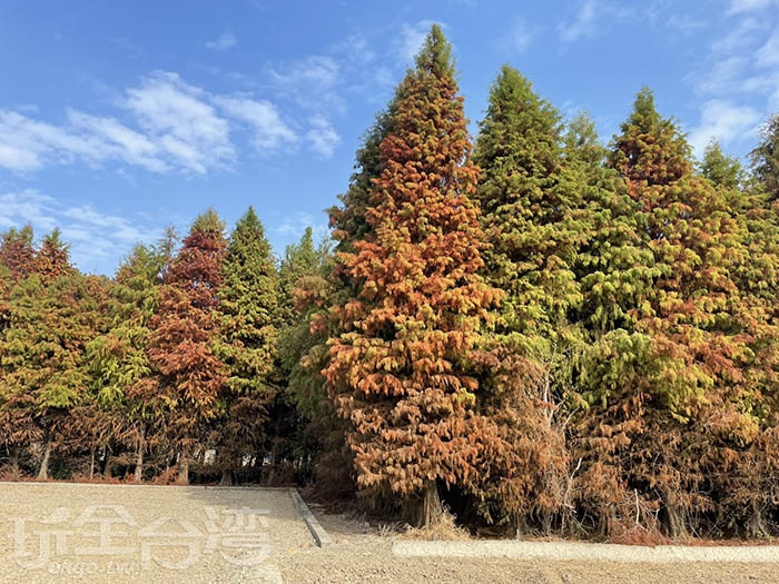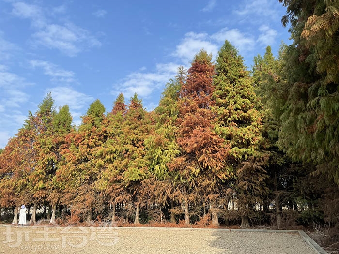除了百日菊花海,花田兩側還種植了大片落羽松。高大挺拔的落羽松在冬季轉色,與色彩鮮明的百日菊形成強烈對比,也讓這裡成為彰化少見同時能欣賞花海與落羽松的景點。不論是情侶約會、親子出遊,或是旅遊拍照取景,都是非常加分的背景。
